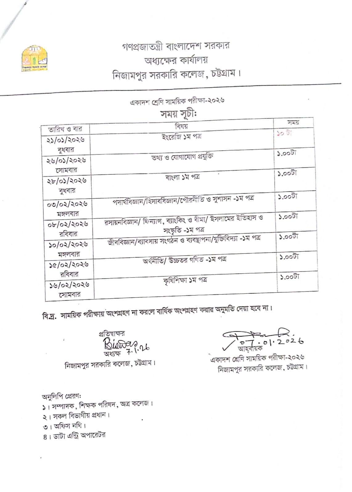 একাদশ সাময়িক পরীক্ষার রুটিন